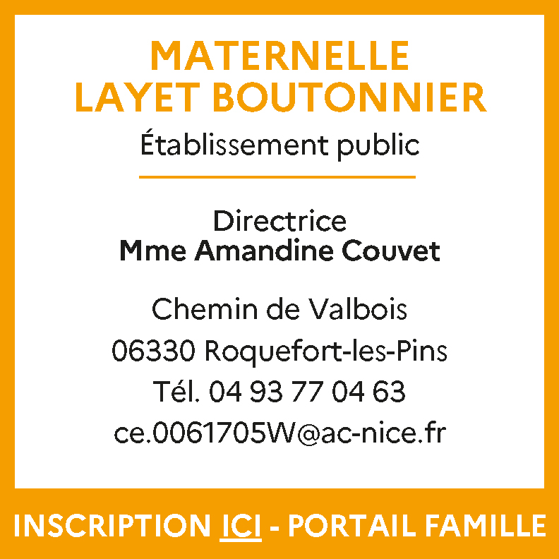 ▶ A partir du lundi 17 mars 2025 : prenez contact avec l'école maternelle ecole.0061705w@ac-nice.fr en joignant le « certificat d'inscription scolaire 2025/2026 » délivré par la mairie, le « dossier d’admission 2025 » ET la « fiche de renseignement 2025 » complétés pour prendre rendez-vous avec la directrice. Lors du rendez-vous l'un des 2 parents devra se présenter (de préférence avec l'enfant) muni du « dossier d'admission 2025 » complété et signé par les 2 parents accompagné des originaux et photocopies des pièces à joindre au dossier.