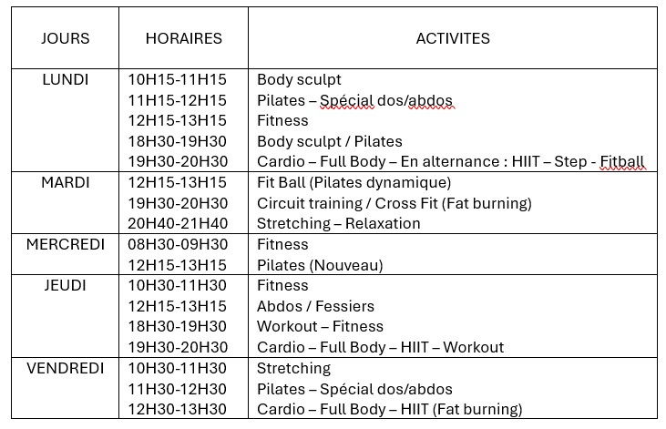Le sport avec Gymnastar et Claudie, c’est l’assurance d’une professionnelle expérimentée au service de votre bien-être, de votre forme et de votre santé. Nous vous proposons des cours de body sculpt, H.I.I.T., fitness, pilates (spécial dos/abdos), circuit training et fat burning (pour différentes catégories d’âge).